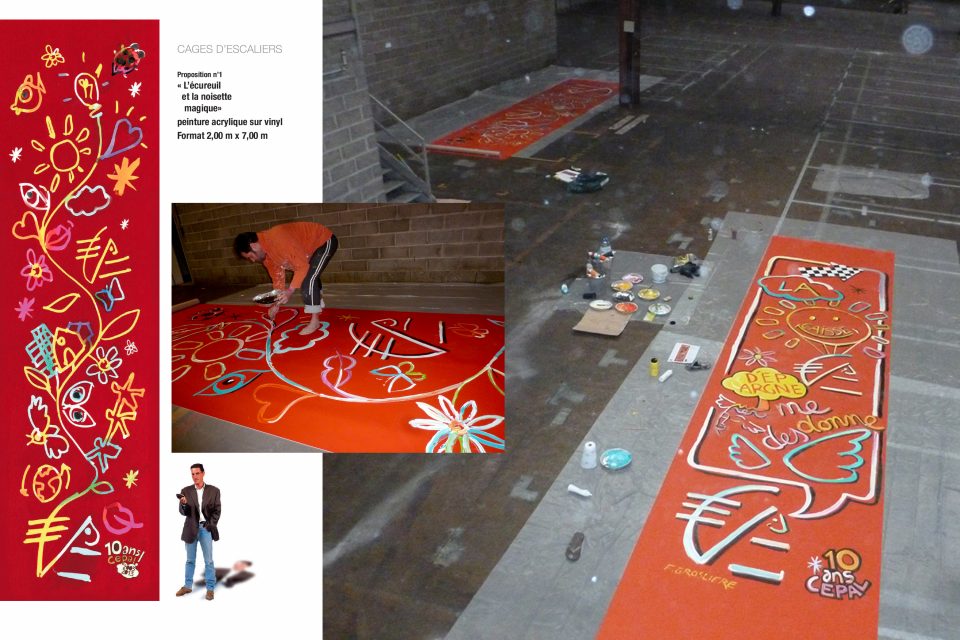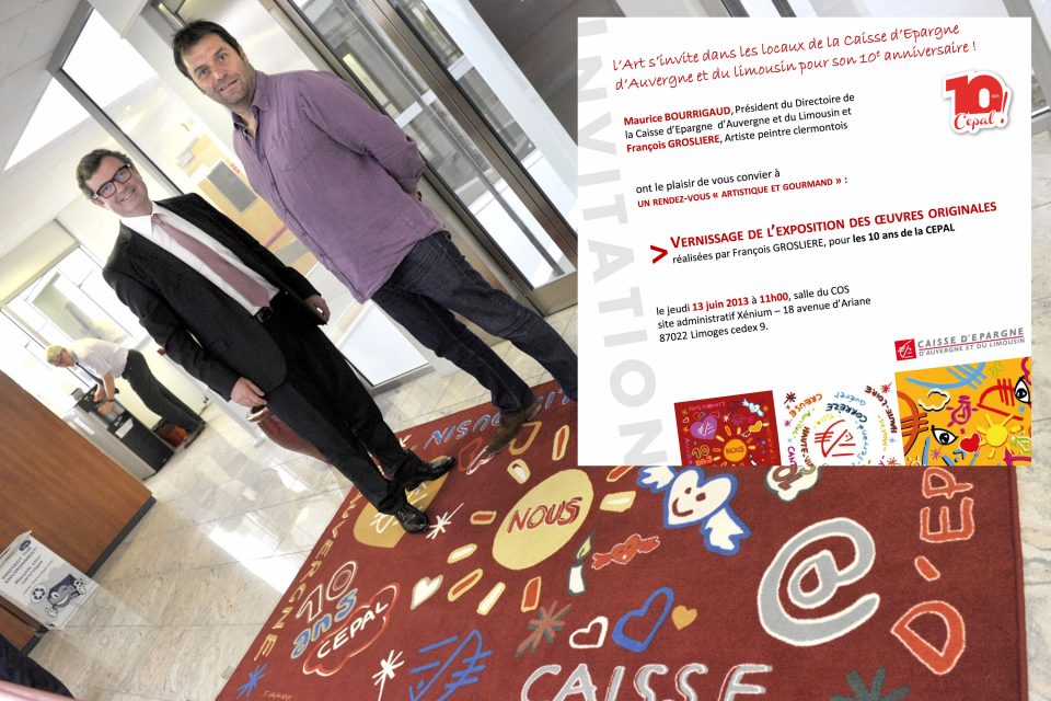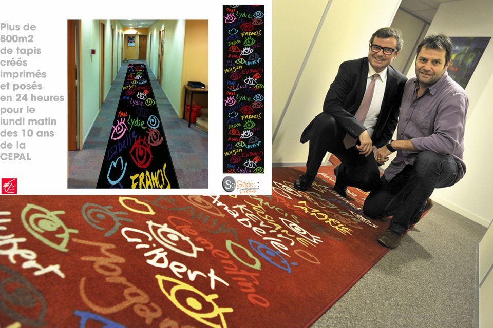 Ma réponse : partant des valeurs de la CEPAL – en phase avec les miennes – de mettre en avant l’Humain et la Couleur, je leur propose de transformer les sièges sociaux de Limoges et de Clermont-Ferrand, avec plus de 800 m2 de tapis, moquette, plexiglas et de peinture créés sur mesure pour la CEPAL. Le tout installé en 24 heures pendant le week-end sur les deux sites. Au sortir des ascenseurs ou dans les salles de réunion, les symboles et les éléments identitaires de la Caisse ont été déclinés à travers des créations aussi étonnantes que détonantes. A chaque étage, ce sont désormais les 372 prénoms portés par les 1 412 collaborateurs de la CEPAL qui guident leurs pas. Au-delà d’un impact visuel, chacun peut découvrir son prénom griffé par l’artiste dans les « couloirs des prénoms »… une façon originale et chaleureuse d’insuffler une nouvelle dynamique au sein de l’environnement de travail partagé par les collaborateurs. Une façon enfin de rendre hommage à l’ensemble des femmes et des hommes qui composent le visage de la Caisse d’Epargne d’Auvergne et du Limousin en 2013 !