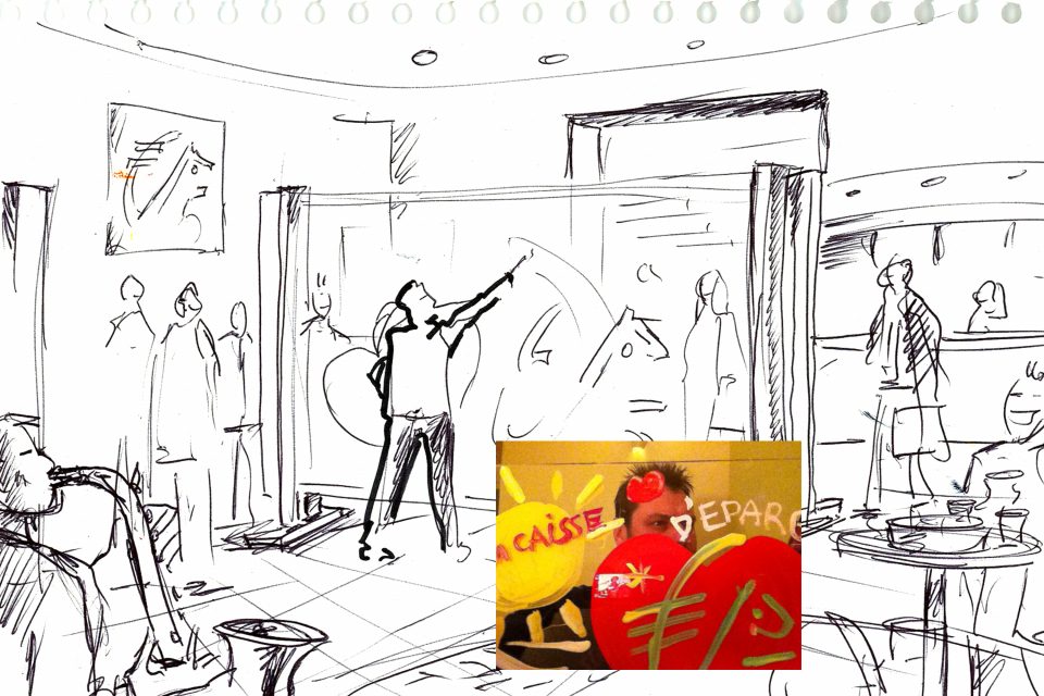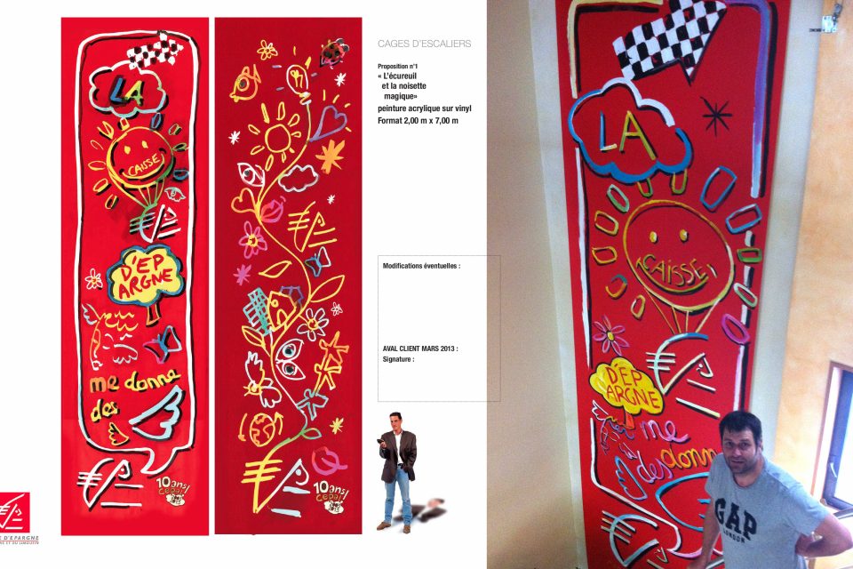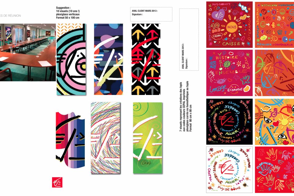800 m2 de création, ma plus belle histoire !Les architectes CHM me consultent avec leur client la Caisse d’Epargne d’Auvergne et du Limousin (CEPAL) suite à un cahier des charges qui devient “Ma plus belle histoire professionnelle “… qui lie mes 2 passions et métiers : publicitaire et artiste.