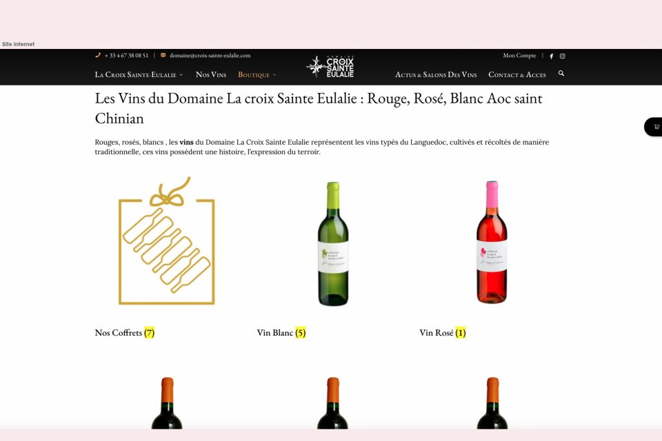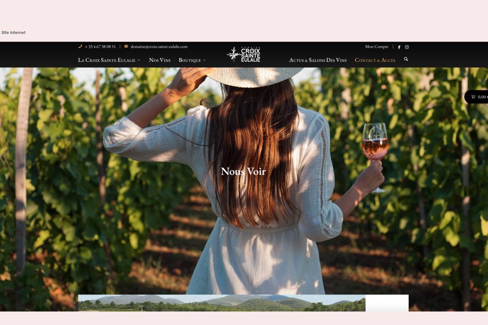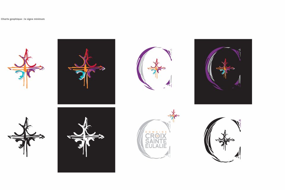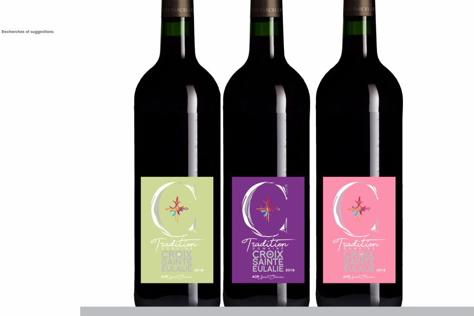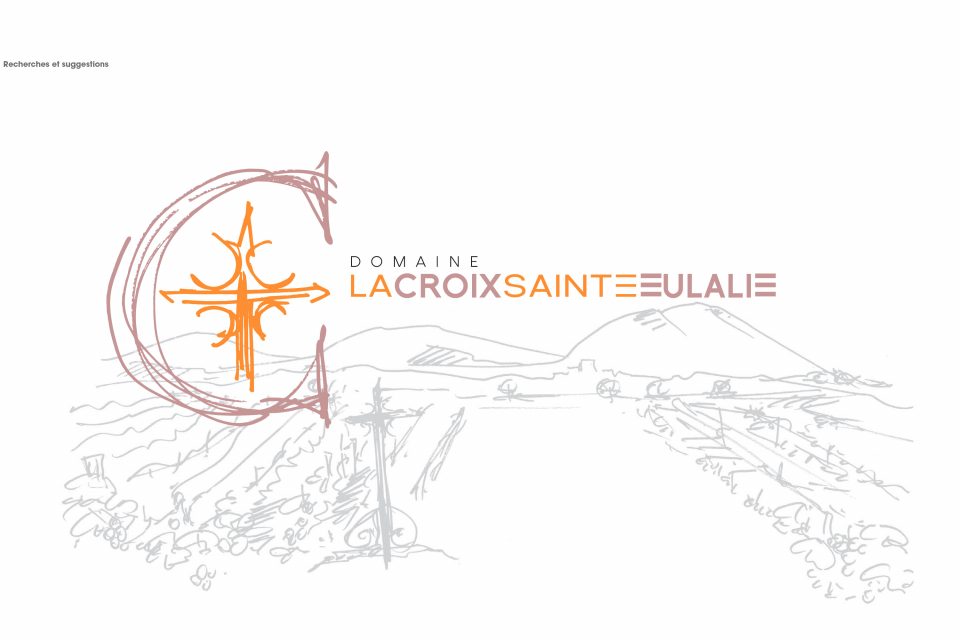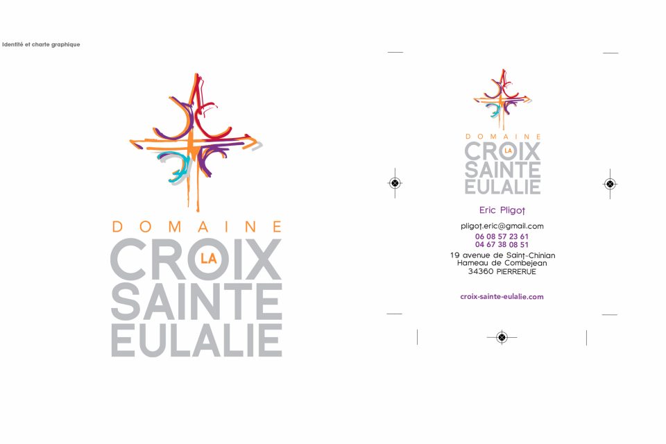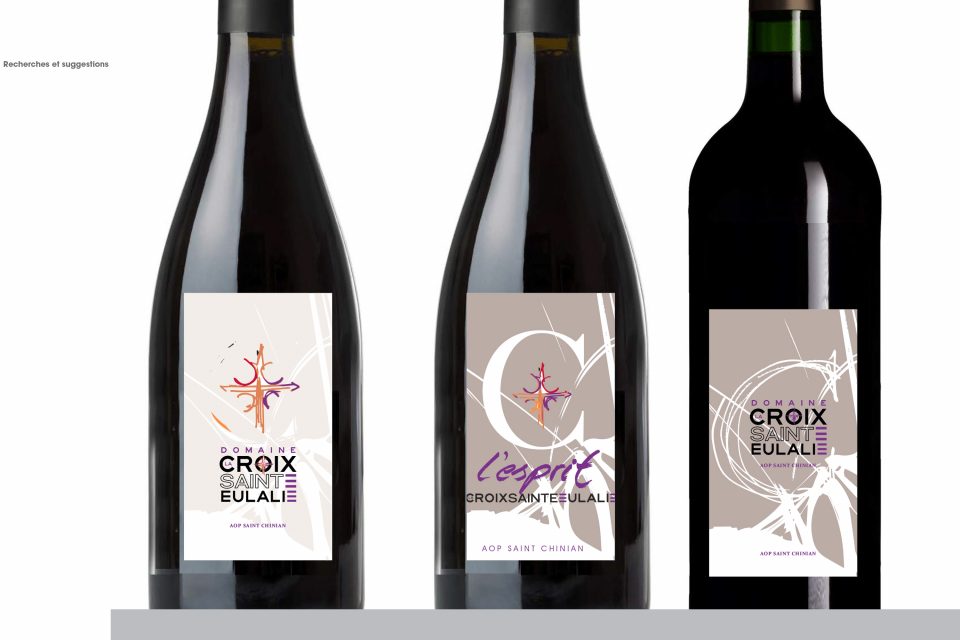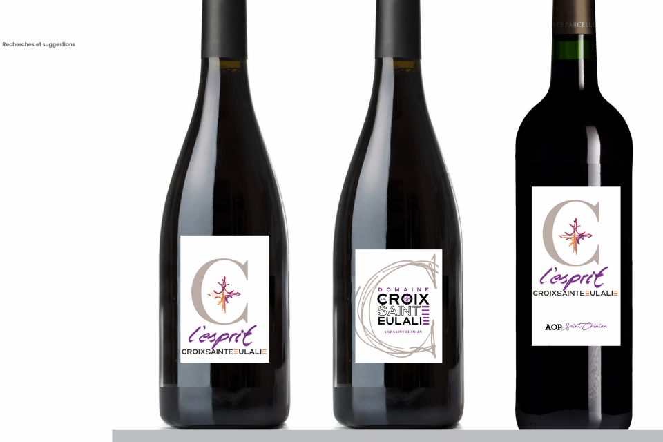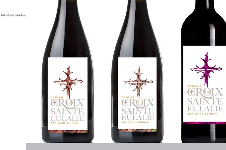 Découlent d’un cahier de recherche : logo, identité graphique, papeterie, PLV pour les salons, site internet, et bien sur ses étiquettes de vin…